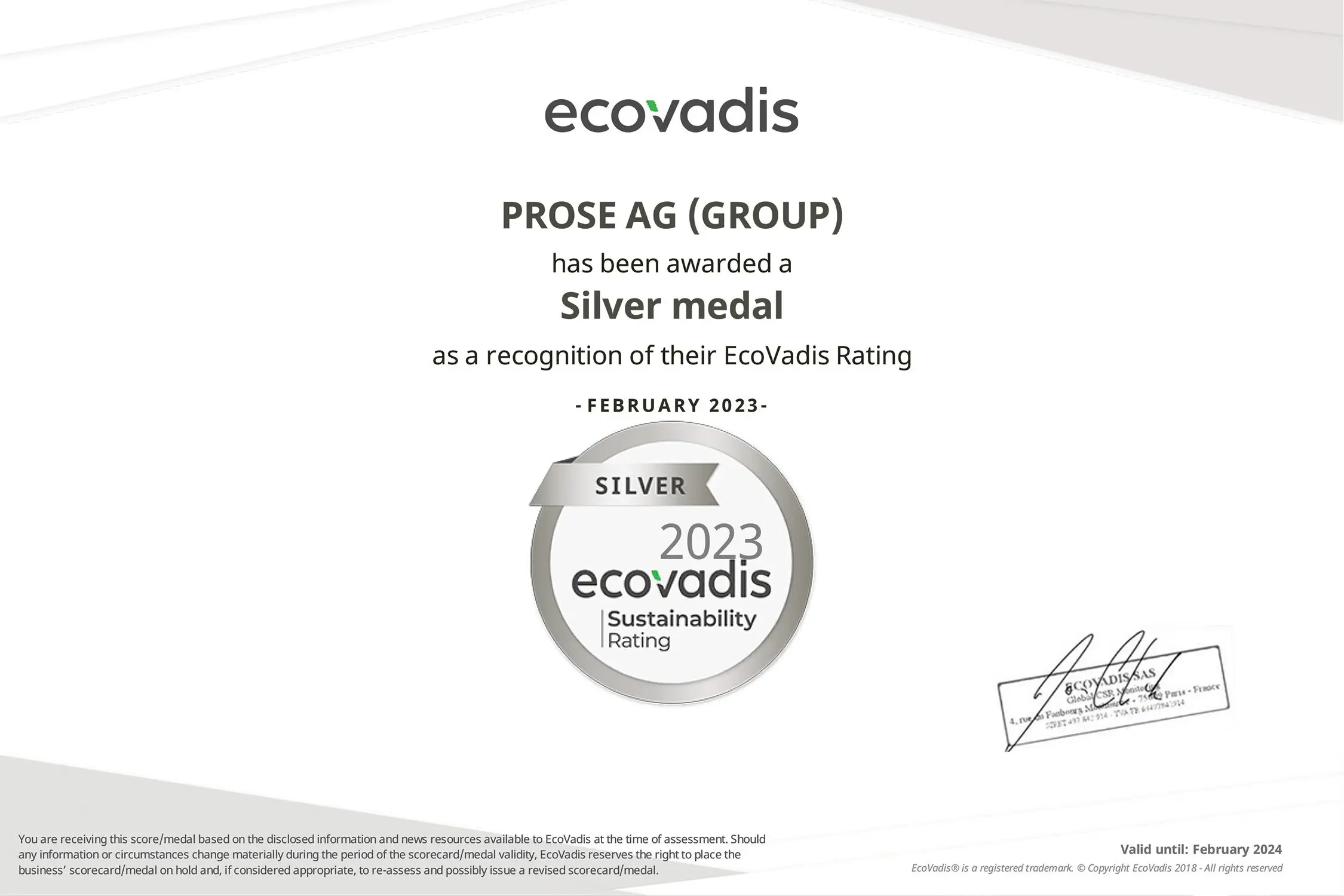 PROSE hat den Silbermedaillen-Status im EcoVadis-Rating gehalten!